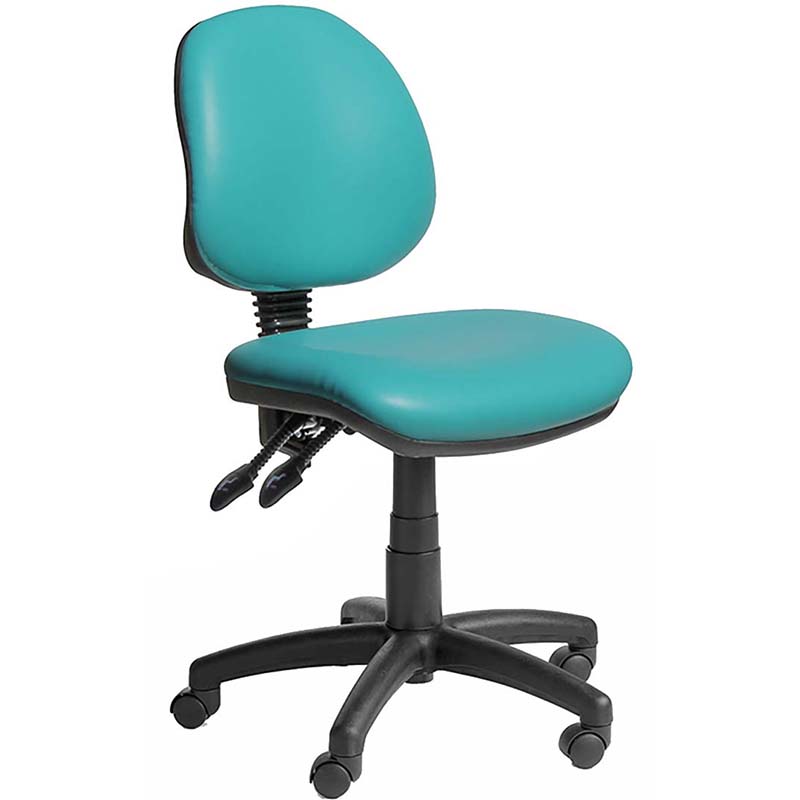 Podiatrist chair fitted with fully ergonomic mechanism allowing for full back adjustment. Supplied castors. Fixed or adjustable arms are also available.