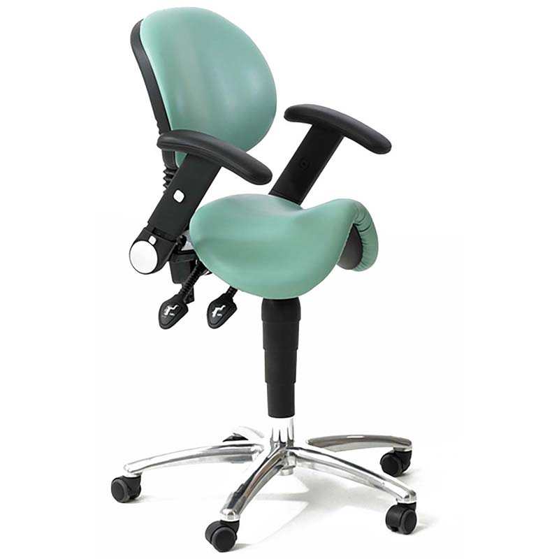 A fully upholstered saddle seat with adjustable arms and back rest. Fitted with a tilting seat mechanism and an aluminium base.The vinyl meets BS5852 Ignition source 5 (Crib 5) and JIS Z 2801:2000 - Effective at reducing the spread of MRSA, E.coli and other similar bacteria.